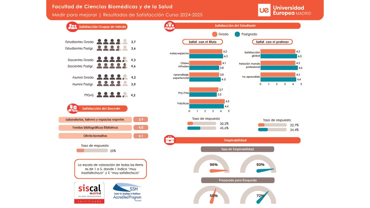 Como parte de su estrategia, la Facultad de Ciencias de la Salud cuenta con un Plan Estratégico en cuyas líneas de trabajo se integra la cultura de calidad y mejora continua de la Universidad Europea de Madrid, vertebrado en su Sistema de Garantía Interna de Calidad (SGIC), de forma que le permita afrontar los retos de futuro con la máxima garantía de éxito. De esta manera, la Facultad de Ciencias de la salud apuesta por la medición y análisis de resultados para la gestión integral y coordinada de sus titulaciones con la participación de los diferentes grupos de interés, y la rendición de cuentas hacia los mismos.